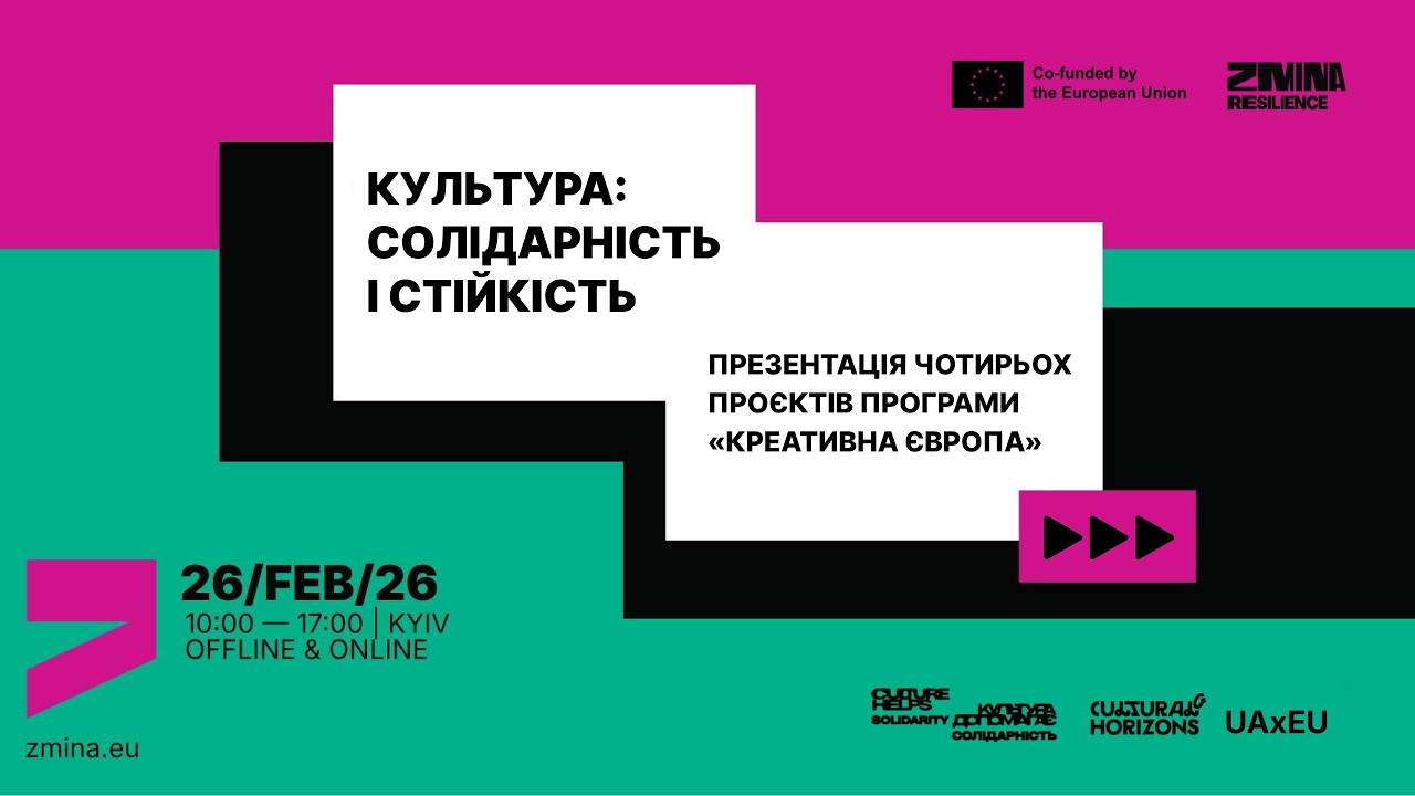 On 26 February 2026, at 10:00 in Kyiv, four projects supported by the European Commission under a special call of the Creative Europe programme for the Ukrainian cultural and creative sectors will be presented. The project teams will introduce ZMINA:Resilience (IZOLYATSIA Foundation, Maly Berlin, Trans Europe Halles), Culture Helps / Культура допомагає (NGO "Insha Osvita", European Cultural Foundation, Zuza, and Veteranka Movement), Cultural Horizons (Ukrainian Cultural Foundation), and UAxEU UkrAinian cultural eXchange with European Union (ELIA, Lviv National Academy of the Arts, the Coalition of Culture Actors, and the Ukrainian Museum Association).
